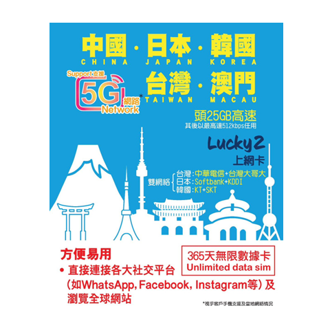 ☉ 漫游流量覆盖 中国内地、韩国、日本、台湾、澳门 通用